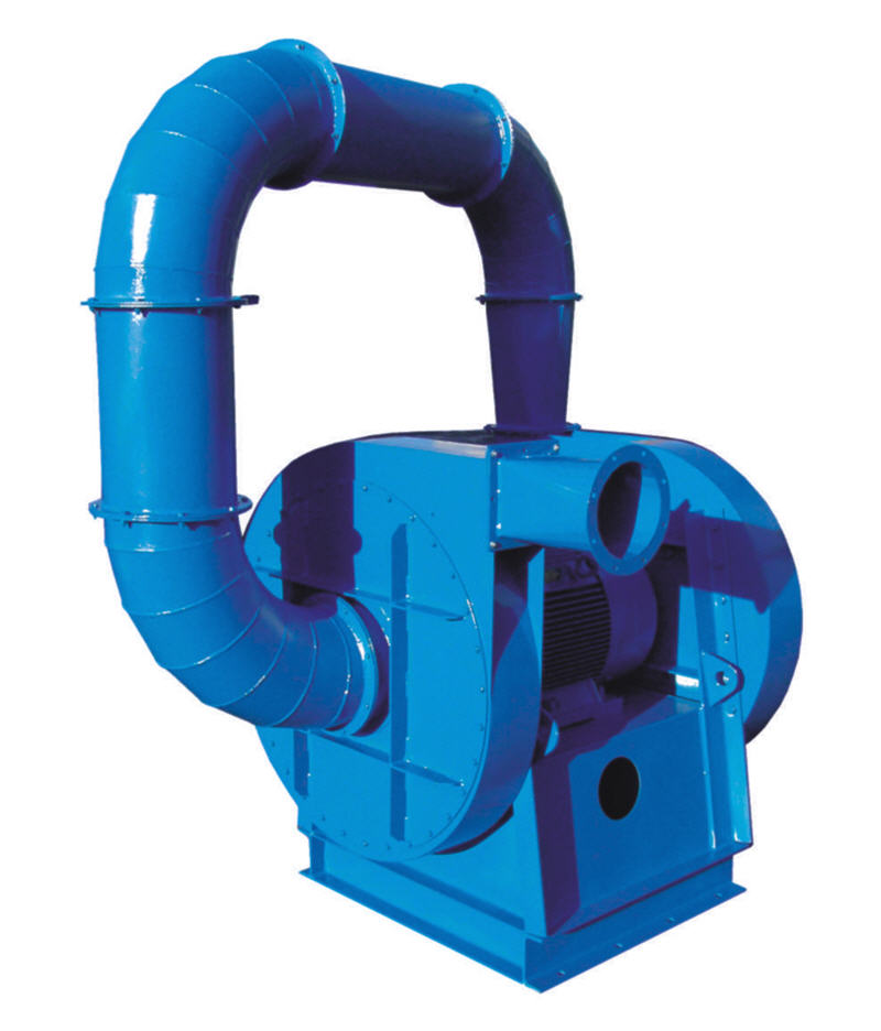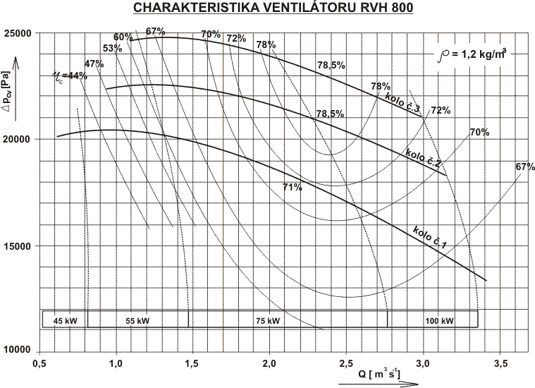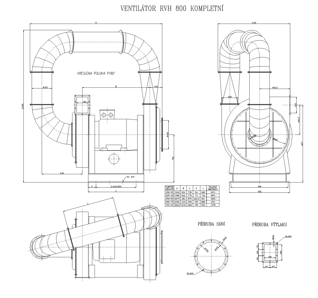 3. Ventilátor RVH 800 je dvoustupňový radiální vysokotlaký ventilátor, poháněný přímo elektromotorem s vyvedenými oběma čepy. Vzdušina je z prvního do druhého stupně ventilátoru přiváděna převáděcím potrubím.